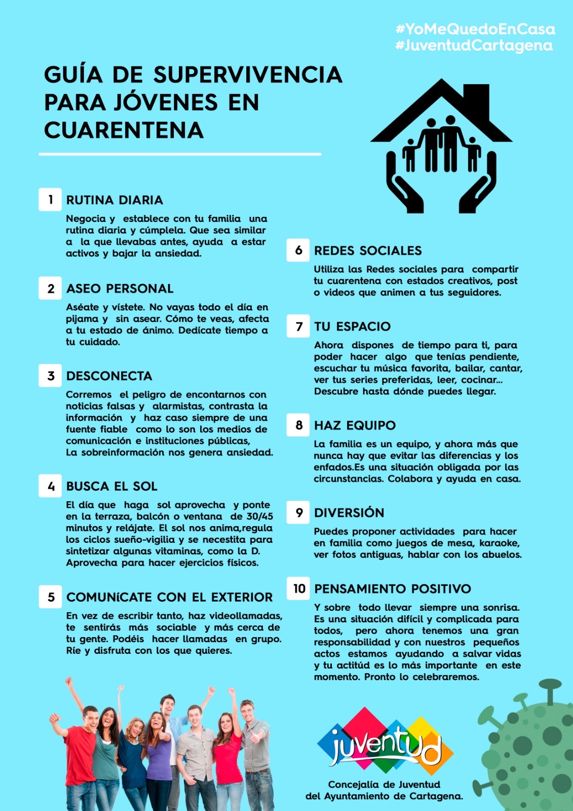 Queremos compartir que, desde el Espacio Salud y Género de la Concejalía de Juventud del Ayuntamiento de Cartagena, conscientes del posible malestar psicológico que genera en los jóvenes el actual confinamiento, han elaborado una breve guía con diez factores de protección dirigido especialmente a ellos: