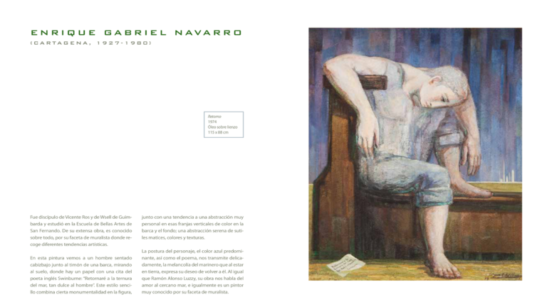 En una visita fugaz al Palacio de Aguirre entramos al MURAM de Cartagena (Museo Regional de Arte Moderno), donde encontramos un cuadro que nos llama la atención. Se trata de una imagen que transmite un halo de nostalgia, de colores suaves y contrastes de luz, al girar la mirada para identificar obra y autor, nos sorprende encontrar una obra titulada “Retorno” de Enrique Gabriel Navarro (1927-1980), pintor cartagenero conocido especialmente por su faceta muralista, discípulo de Vicente Ros y Wsell de Guimbarda, que estudió en la Escuela de Bellas Artes de San Fernando.