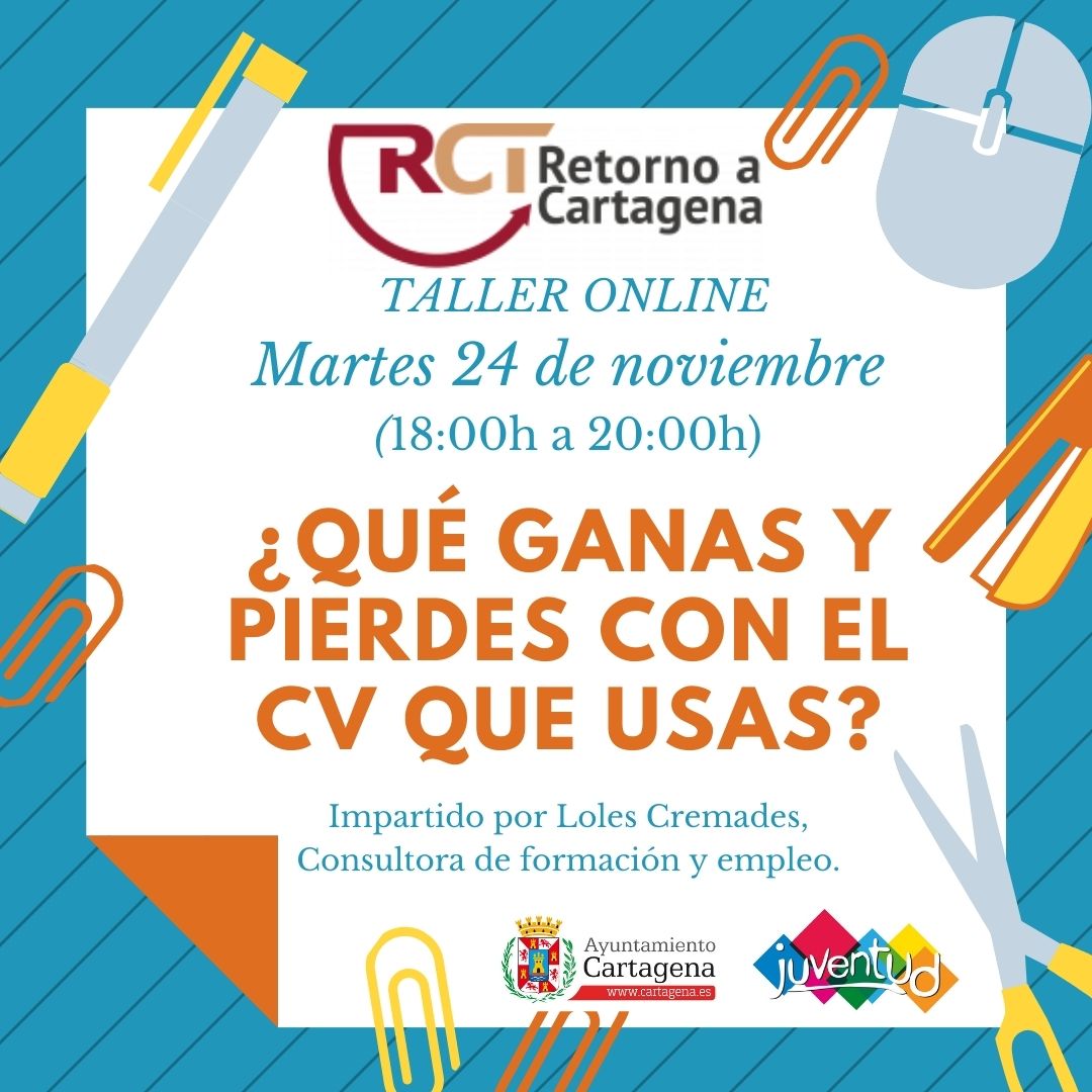 Dada la demanda que hemos tenido por parte de nuestros jóvenes, desde Retorno Talento a Cartagena queremos darles claves y consejos en el próximo taller Online “¿Qué ganas y pierdes con el CV que usas?”que tendrá lugar el 24 de noviembre, de 18:00h a 20:00h y será impartido por Loles Cremades, Consultora de formación, empleo y desarrollo profesional.